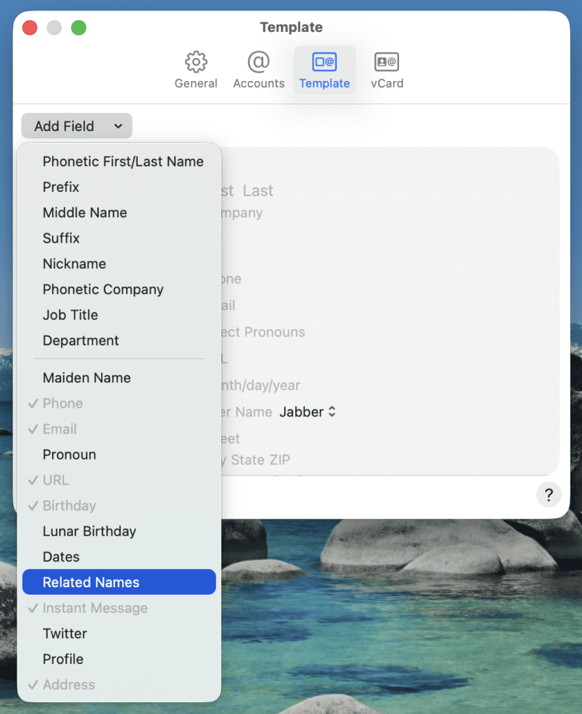 - In the “Add Field” pulldown, select “Related Names” (if it is not already selected). This will add a related names field to your Contacts template