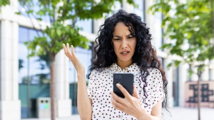 woman outdoors in a city setting with a couple of trees in the background. she's holding her phone in one hand and shrugging with the other hand. her face is confused and befuddled.